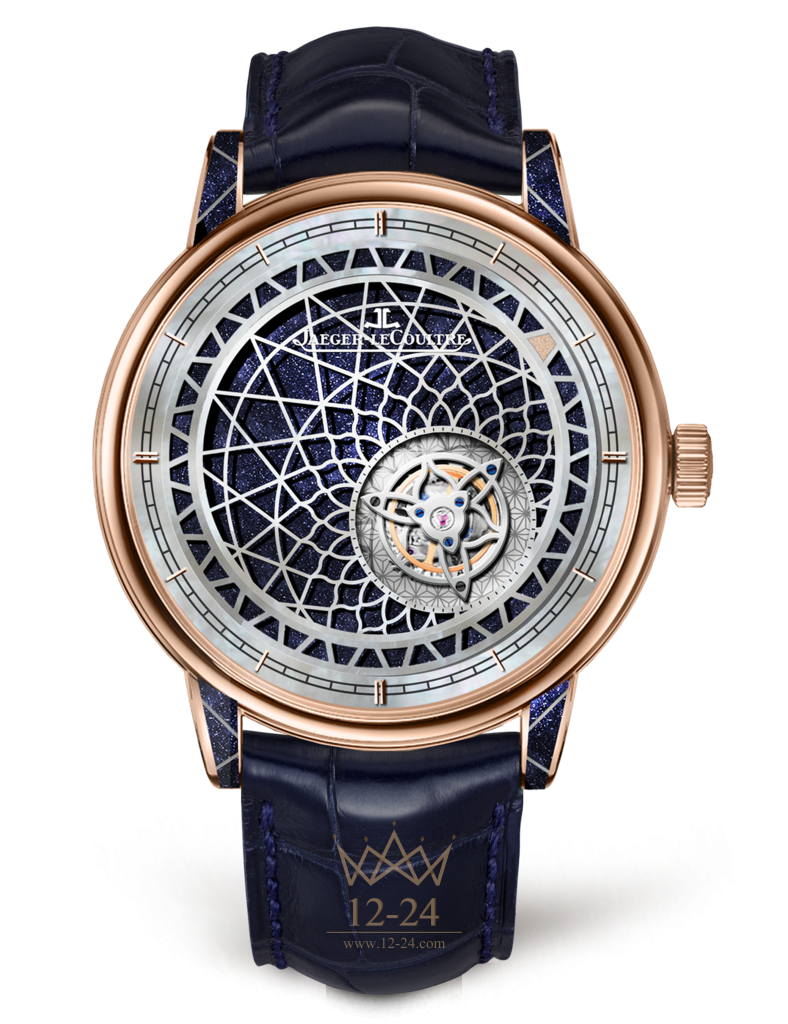 Прозрачная задняя крышка корпуса позволяет насладиться красотой украшенного авантюрином скелетонизированного ротора, который демонстрирует мастерство специалистов редких профессий Jaeger‑LeCoultre. Поверхность сапфирового стекла украшена изящным узором из розового золота, дополняющим архитектурный мотив циферблата.