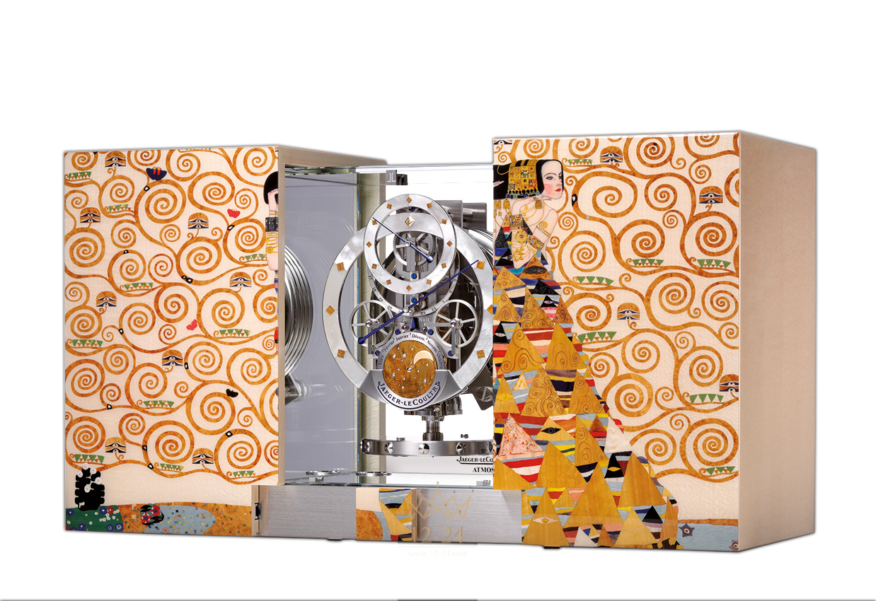 Культовые часы Atmos - это, без преувеличения, настоящий вечный двигатель. Atmos имеют автоподзавод, работающий благодаря изменению объема газа хлорэтилена в специальной мембране-гармошке. Гармошка расширяется, либо сжимается под влиянием изменения температуры даже на 1°C, накапливая тем самым запас хода. А поскольку даже в закрытом помещении существуют минимальные колебания температуры, эти часы действительно способны работать вечно. Колесо баланса колеблется удивительно медленно, делая всего 2 оборота в минуту и сводя тем самым расход энергии к минимуму. Новая версия Atmos Jaeger-LeCoultre является продолжением специальной художественной серии, начатой в 2008 году и посвященной Густаву Климту. Эти часы Atmos характеризуются оформлением корпуса: как правило, на нем помещаются фрагменты самых знаменитых работ австрийского художника, выполненные в технике маркетри. Автоматически открывающийся футляр этой модели сам по себе уже является произведением искусства: на нем изображена репродукция картины «Ожидание» работы Густава Климта, выполненная из более чем 1200 кусочков дерева 35 различных пород! Для исполнения такой тонкой работы потребовалось несколько сотен часов работы мастеров. Циферблат был выполнен в столь же утонченном стиле: минутный и часовые диски сделаны из перламутра, минутный диск украшен желтым сапфиром на отметке "60"; диск с фазами Луны имеет золочение и паваж из белых бриллиантов, роль часовых индексов играют ромбовидные кусочки дерева. Механизм Calibre 582 Jaeger-LeCoultre, состоящий из 386 деталей, обеспечивает 24-часовую индикацию, календарь с фазами Луны, отдельную индикацию месяца.