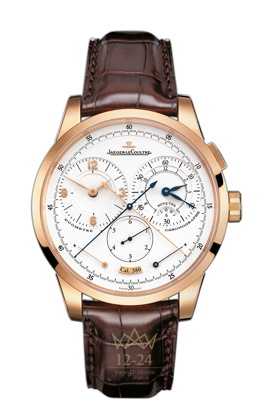 Словно в ознаменование системы Dual-Wing, циферблат также визуально разделен на две части: циферблат часов и минут смещен от центра к 10 часам, его зеркальным отражением является запатентованный счетчик минут, интегрированный в единый счетчик хронографа - у отметки "2 часа". Объединяет «половинки» циферблата прикрепленный к спусковому колесу счетчик 1/6 долей секунды. На позиции "6 часов" установлена табличка с выгравированным названием мануфактурного калибра JLC 380, по бокам от нее находятся два индикатора запаса хода - по 50 часов каждый. Отдельное удовольствие - ознакомиться с красотой механизма через прозрачную заднюю крышку, ведь там располагается тщательно отделанный и декорированный калибр JLC 380 из более чем 390 деталей, с двумя заводными барабанами и с частотой колебания баланса 21 600 пк/час. Классический циферблат украшен мелкозернистым декором в стиле «яичная скорлупа». Модель предлагается в корпусе из розового золота на классическом ремешке из кожи аллигатора.