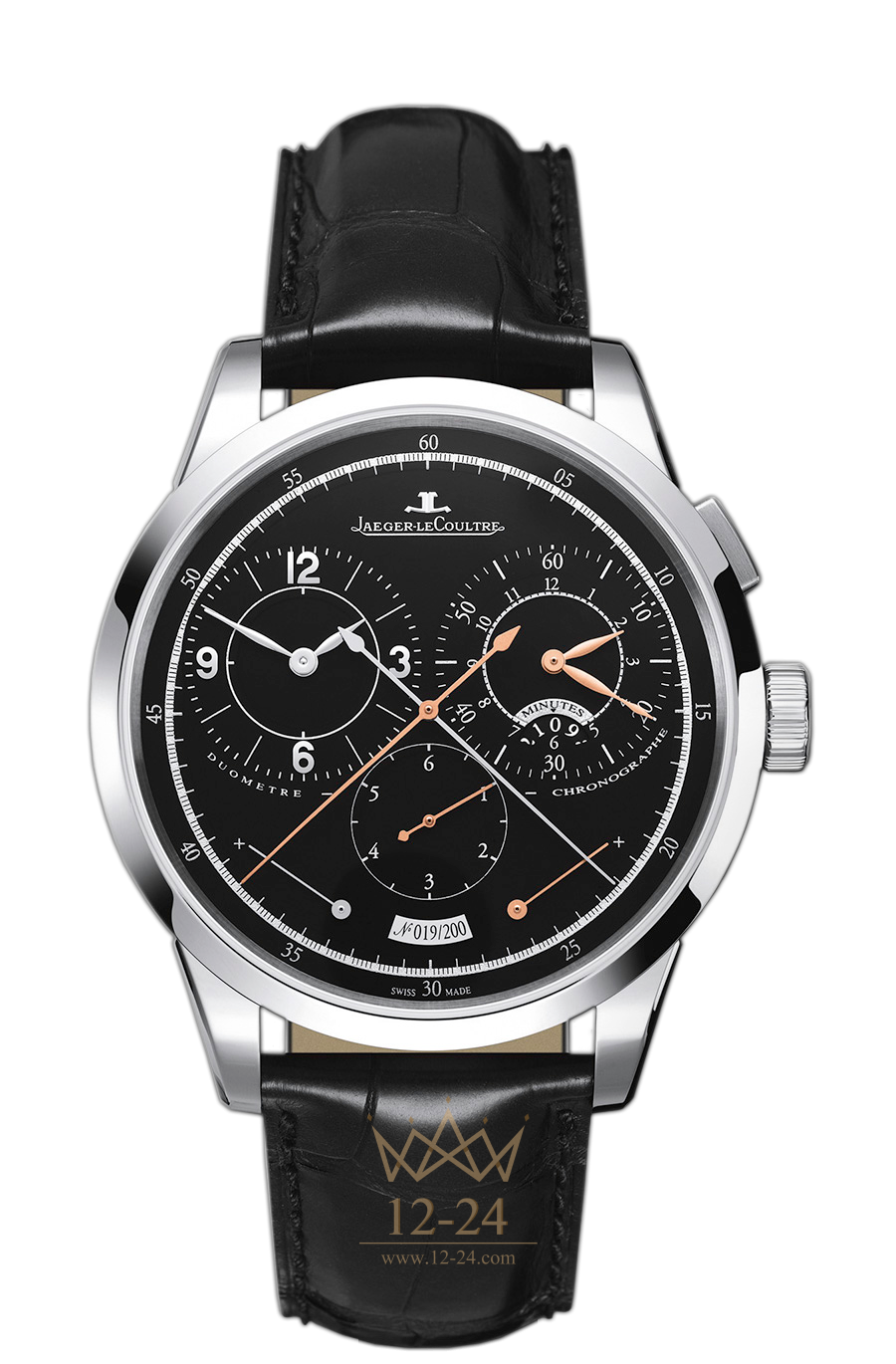 Словно в ознаменование системы Dual-Wing, циферблат также визуально разделен на две части: циферблат часов и минут смещен от центра к 10 часам, его зеркальным отражением является запатентованный счетчик минут, интегрированный в единый счетчик хронографа - у отметки "2 часа". Объединяет «половинки» циферблата прикрепленный к спусковому колесу счетчик 1/6 долей секунды. На позиции "6 часов" установлена табличка с выгравированным названием мануфактурного калибра JLC 380, по бокам от нее находятся два индикатора запаса хода - по 50 часов каждый. Отдельное удовольствие - ознакомиться с красотой механизма через прозрачную заднюю крышку, ведь там располагается тщательно отделанный и декорированный калибр JLC 380 из более чем 390 деталей, с двумя заводными барабанами и с частотой колебания баланса 21 600 пк/час. Модель с черным матовым циферблатом предлагается в корпусе из белого золота на классическом ремешке из кожи аллигатора.