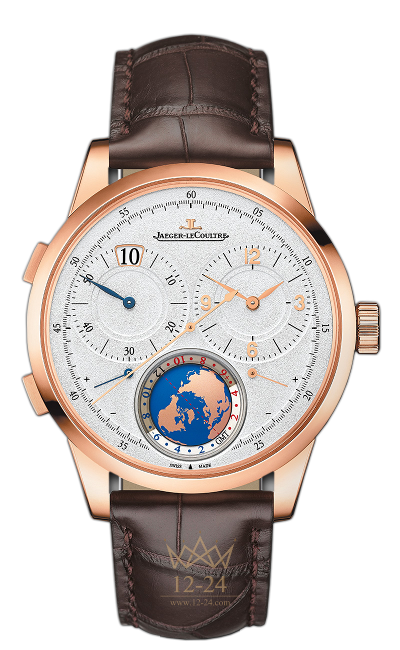 Функции: аналоговая индикация местного времени (на циферблате с накладными золотистыми арабскими цифрами, расположенном на 2 часах), индикация времени второго часового пояса (посредством цифровой указатель часов в апертуре и вороненой минутной стрелки на циферблате, расположенном на 10 часах), индикация дня/ночи и времени второго часового пояса (на круглом указателе в виде земного шара, вместе с разметкой часовых поясов), а также индикация запаса хода каждого из двух калибров (аналоговые указатели на 4 и 8 часах). Механизм Jaeger-LeCoultre 383 изготовлен, собран, а также отменно отделан и декорирован вручную. Поставляется на коричневом ремешке из кожи аллигатора с застежкой из 18-каратного розового золота.