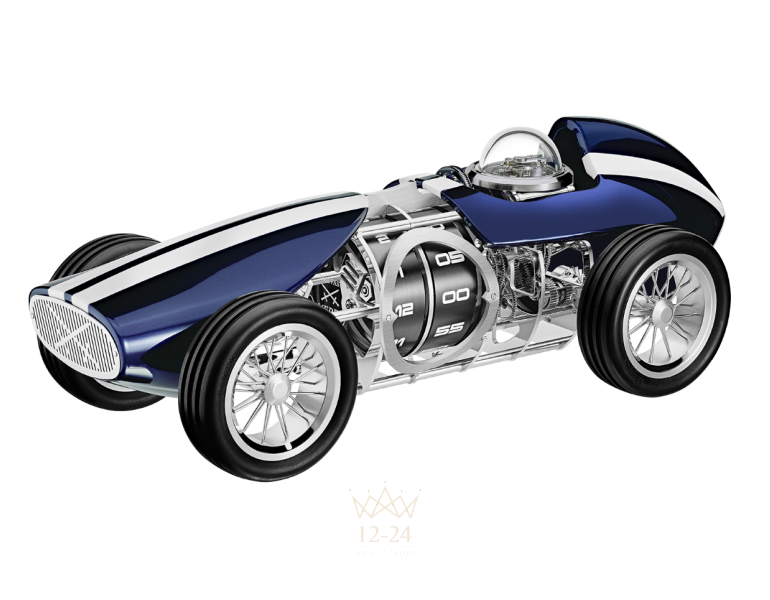 Часы и минуты текущего времени отображаются на боковой поверхности кузова — там, где у гоночного автомобиля размещался идентификационный номер. На месте водителя хорошо виден купол из сапфирового стекла, напоминающий шлем пилота. В нем заключен механизм спуска, совершающий колебания с высокой частотой. Перед ним располагается характерный для гоночных автомобилей руль с тремя спицами, который служит здесь для настройки времени.
