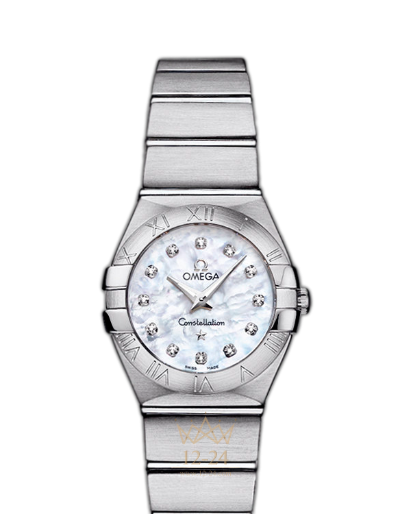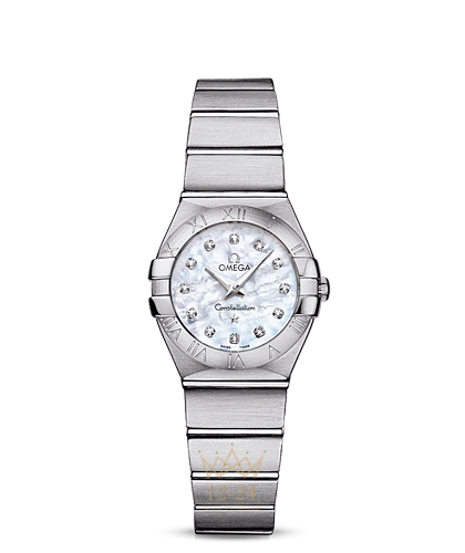 Эта сатинированная модель имеет белый перламутровый циферблат с бриллиантовыми часовыми метками, который накрыт устойчивым к царапинам сапфировым стеклом. Безель с выгравированными римскими цифрами закреплен на корпусе диаметром 24 мм из нержавеющей стали. Часы дополняет браслет из нержавеющей стали. В этих часах используется высокоточный кварцевый механизм OMEGA, калибр 1376.