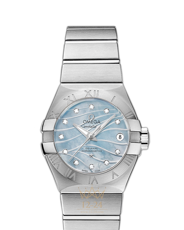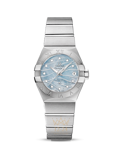 Данная модель имеет гравированный голубой перламутровый циферблат с узором из расходящихся от легендарных скобок волн. Циферблат насчитывает 11 бриллиантовых часовых меток. В положении «3 часа» находится окошко указателя даты. Безель с выгравированными римскими цифрами закреплен на корпусе диаметром 27 мм из нержавеющей стали, который дополнен стальным браслетом. В часах используется коаксиальный часовой механизм OMEGA, калибр 8520.