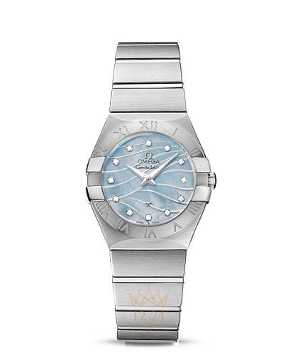 Необычайно эффектный дизайн часов OMEGA Constellation прошел проверку временем. Его характерной особенностью стали знаменитые скобки по бокам часового корпуса и впечатляющие циферблаты. Данная модель имеет гравированный голубой перламутровый циферблат с узором из расходящихся от легендарных скобок волн. Циферблат насчитывает 12 бриллиантовых часовых меток. Безель из нержавеющей стали с выгравированными римскими цифрами закреплен на корпусе диаметром 27 мм из нержавеющей стали. Часы дополняет стальной браслет. В часах используется кварцевый часовой механизм OMEGA, калибр 1376.