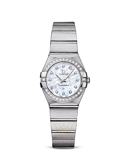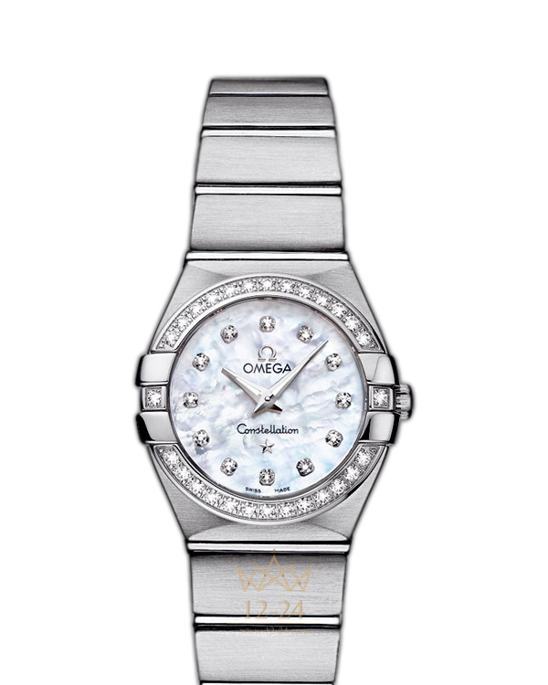 Эта сатинированная модель имеет белый перламутровый циферблат с бриллиантовыми часовыми метками, который накрыт устойчивым к царапинам сапфировым стеклом. Украшенный бриллиантами безель закреплен на корпусе диаметром 24 мм из нержавеющей стали, который дополнен стальным . В этих часах используется высокоточный кварцевый механизм OMEGA, калибр 1376.