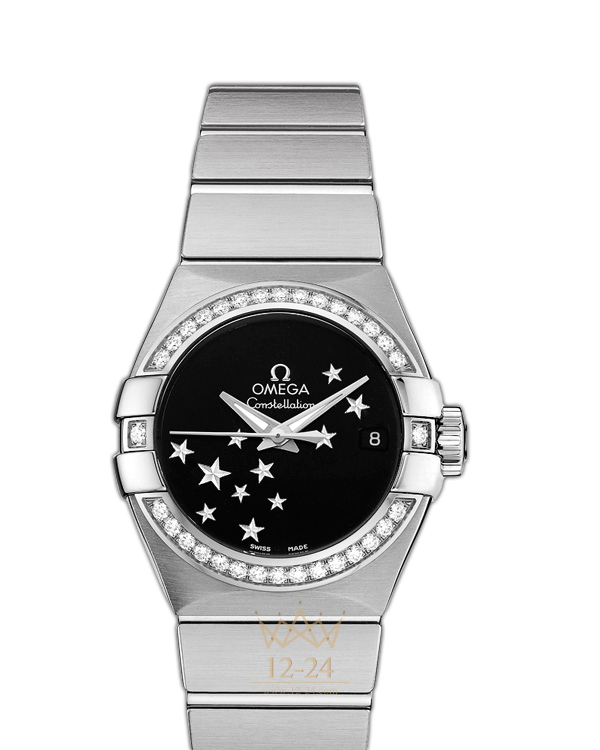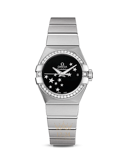 Эта сатинированная модель имеет черный циферблат с россыпью накладных позолоченных звезд, который накрыт устойчивым к царапинам сапфировым стеклом. Украшенный бриллиантами безель закреплен на корпусе диаметром 27 мм из нержавеющей стали, который дополнен стальным . В этой модели используется коаксиальный часовой механизм OMEGA, калибр 8520, который виден сквозь прозрачную заднюю крышку корпуса.