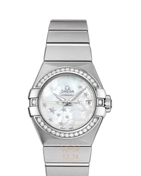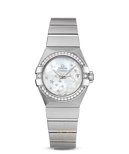 Эта сатинированная модель имеет белый перламутровый циферблат с россыпью накладных позолоченных звезд, который накрыт устойчивым к царапинам сапфировым стеклом. Украшенный бриллиантами безель закреплен на корпусе диаметром 27 мм из нержавеющей стали, который дополнен стальным браслетом. В этой модели используется коаксиальный часовой механизм OMEGA, калибр 8520, который виден сквозь прозрачную заднюю крышку корпуса.