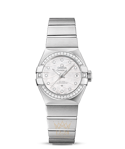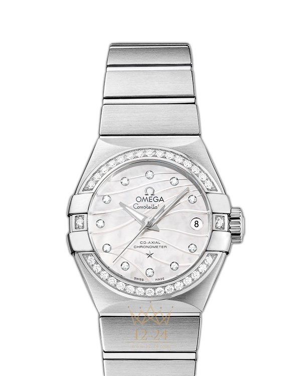 Данная модель имеет гравированный белый перламутровый циферблат с узором из расходящихся от легендарных скобок волн. Циферблат насчитывает 11 бриллиантовых часовых меток. В положении «3 часа» находится окошко указателя даты. Украшенный бриллиантами безель закреплен на корпусе диаметром 27 мм из нержавеющей стали, который дополнен стальным браслетом. В часах используется коаксиальный часовой механизм OMEGA, калибр 8520.
