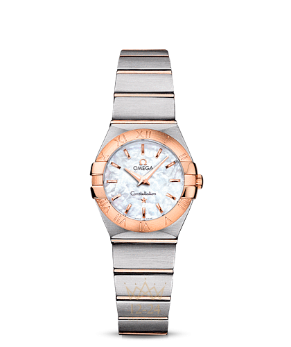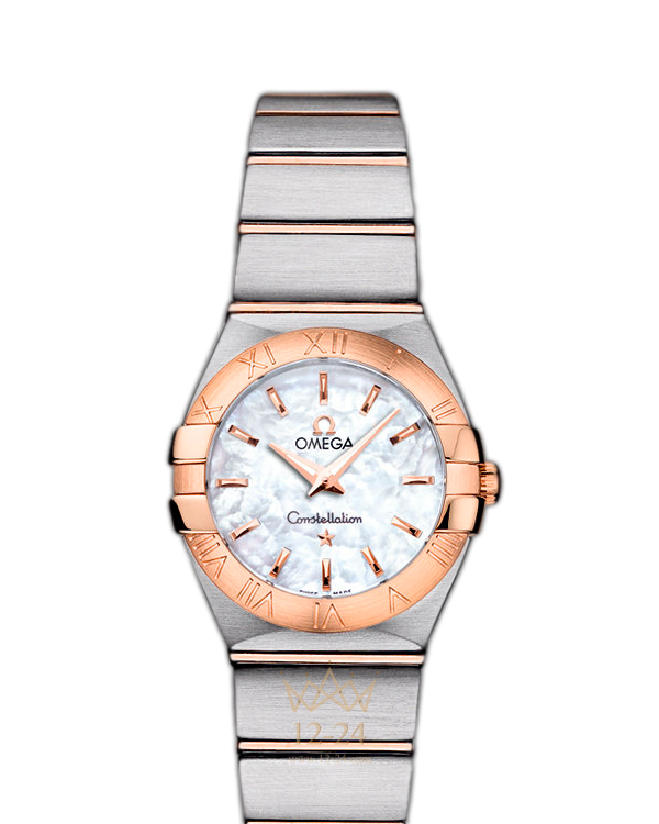 Эта сатинированная модель имеет белый перламутровый циферблат, который накрыт устойчивым к царапинам сапфировым стеклом. Безель из 18-каратного розового золота с выгравированными римскими цифрами закреплен на корпусе диаметром 24 мм из нержавеющей стали, который дополнен из нержавеющей стали и 18-каратного розового золота. В этих часах используется высокоточный кварцевый механизм OMEGA, калибр 1376.