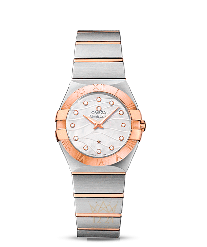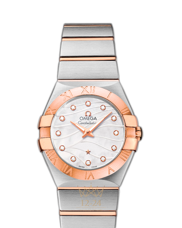 Необычайно эффектный дизайн часов OMEGA Constellation прошел проверку временем. Его характерной особенностью стали знаменитые скобки по бокам часового корпуса и впечатляющие циферблаты. Данная модель имеет гравированный белый перламутровый циферблат с узором из расходящихся от легендарных скобок волн. Циферблат насчитывает 12 бриллиантовых часовых меток. Безель из 18-каратного розового золота с выгравированными римскими цифрами закреплен на корпусе диаметром 27 мм из нержавеющей стали, который дополнен стальным с соединительными элементами из 18-каратного розового золота. В часах используется кварцевый часовой механизм OMEGA, калибр 1376.
