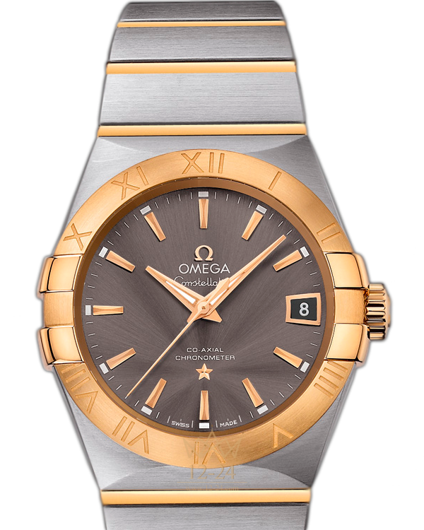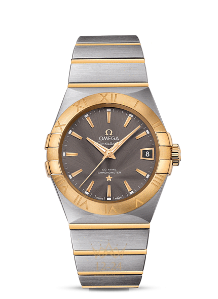Эта модель имеет серый циферблат теплого оттенка с окошком указателя даты в положении «3 часа» и устойчивым к царапинам сапфировым стеклом. Безель из 18-каратного желтого золота с выгравированными римскими цифрами закреплен на корпусе диаметром 38 мм из нержавеющей стали, который дополнен стальным браслетом с соединительными элементами из 18-каратного желтого золота. В этой модели используется коаксиальный часовой механизм OMEGA, калибр 8500, который виден сквозь сапфировое стекло задней крышки корпуса.