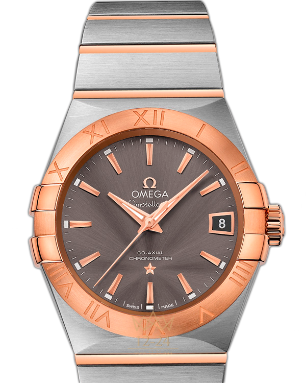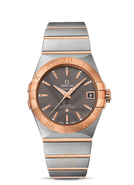Эта модель имеет серый циферблат теплого оттенка с окошком указателя даты в положении «3 часа» и устойчивым к царапинам сапфировым стеклом. Безель из 18-каратного розового золота с выгравированными римскими цифрами закреплен на корпусе диаметром 38 мм из нержавеющей стали, который дополнен стальным браслетом с соединительными элементами из 18-каратного розового золота. В этой модели используется коаксиальный часовой механизм OMEGA, калибр 8500, который виден сквозь сапфировое стекло задней крышки корпуса.