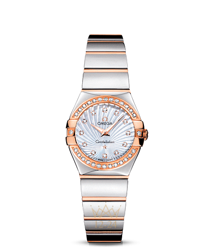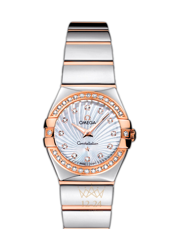 Эта полированная модель имеет белый перламутровый циферблат с узором Supernova и бриллиантовыми часовыми метками, который накрыт устойчивым к царапинам сапфировым стеклом. Украшенный бриллиантами безель из 18-каратного розового золота закреплен на корпусе диаметром 24 мм из нержавеющей стали, который дополнен из нержавеющей стали и 18-каратного розового золота. В этих часах используется высокоточный кварцевый механизм OMEGA, калибр 1376.