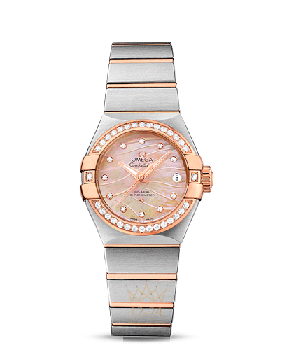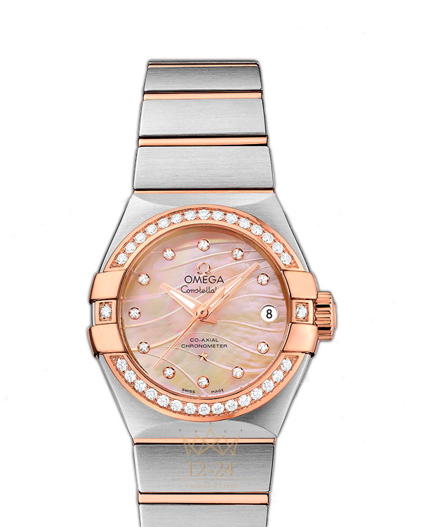 Данная модель имеет гравированный циферблат из натурального перламутра золотистого цвета с узором из расходящихся от легендарных скобок волн. Циферблат насчитывает 11 бриллиантовых часовых меток. В положении «3 часа» находится окошко указателя даты. Украшенный бриллиантами безель из 18-каратного розового золота закреплен на корпусе диаметром 27 мм из нержавеющей стали, который дополнен стальным с соединительными элементами из 18-каратного розового золота. В часах используется коаксиальный часовой механизм OMEGA, калибр 8520.