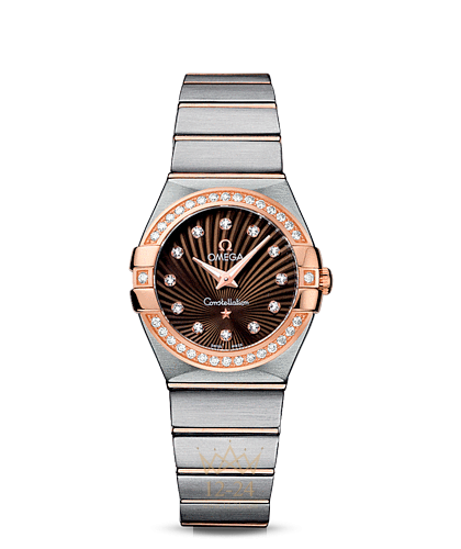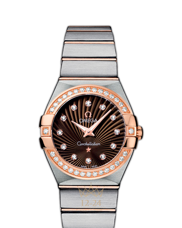 Необычайно эффектный дизайн часов OMEGA Constellation прошел проверку временем. Его характерной особенностью стали знаменитые скобки по бокам часового корпуса и впечатляющие циферблаты. Эта сатинированная модель имеет коричневый циферблат с узором Supernova и бриллиантовыми часовыми метками, который накрыт устойчивым к царапинам сапфировым стеклом. Украшенный бриллиантами безель из 18-каратного розового золота закреплен на корпусе диаметром 27 мм из нержавеющей стали, который дополнен из нержавеющей стали и 18-каратного розового золота. В этих часах используется высокоточный кварцевый механизм OMEGA, калибр 1376.