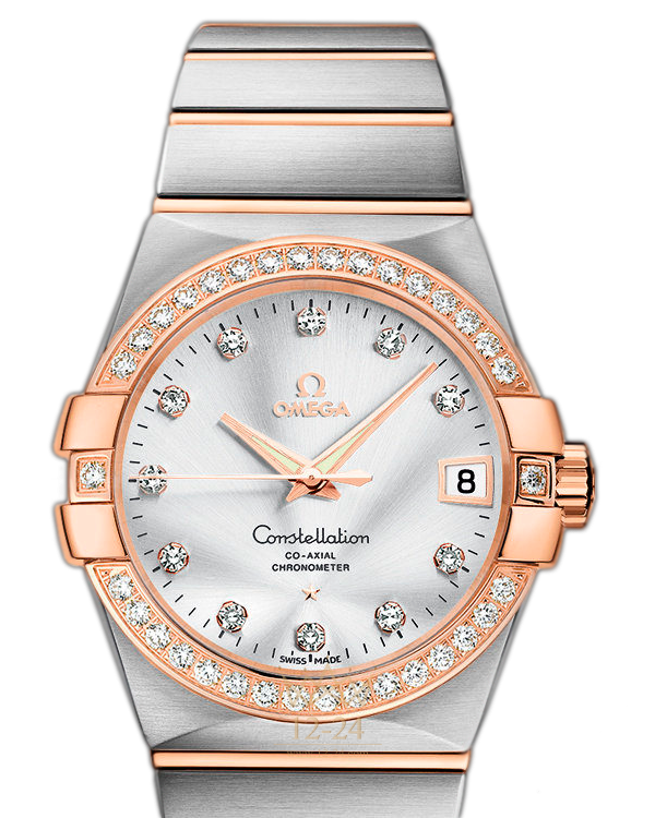 Эта модель имеет украшенный бриллиантовыми часовыми метками серебристый циферблат с окошком указателя даты в положении «3 часа» и устойчивым к царапинам сапфировым стеклом. Украшенный бриллиантами безель из 18-каратного розового золота закреплен на корпусе диаметром 38 мм из нержавеющей стали, который дополнен браслетом из нержавеющей стали и 18-каратного розового золота. В этих изысканных часах используется коаксиальный часовой механизм OMEGA, калибр 8500, который виден сквозь прозрачную заднюю крышку корпуса.