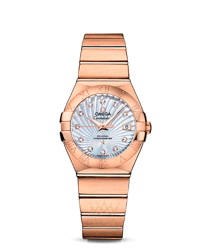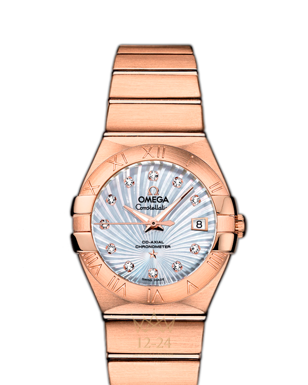 Эта сатинированная модель имеет белый перламутровый циферблат с узором Supernova и бриллиантовыми часовыми метками, который накрыт устойчивым к царапинам сапфировым стеклом. Безель с выгравированными римскими цифрами закреплен на корпусе диаметром 27 мм из 18-каратного розового золота. Часы дополняет из 18-каратного розового золота. Основу этих часов составляет коаксиальный часовой механизм OMEGA, калибр 8521, который виден сквозь прозрачную заднюю крышку корпуса.