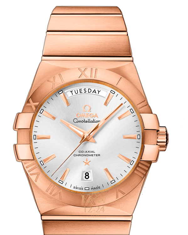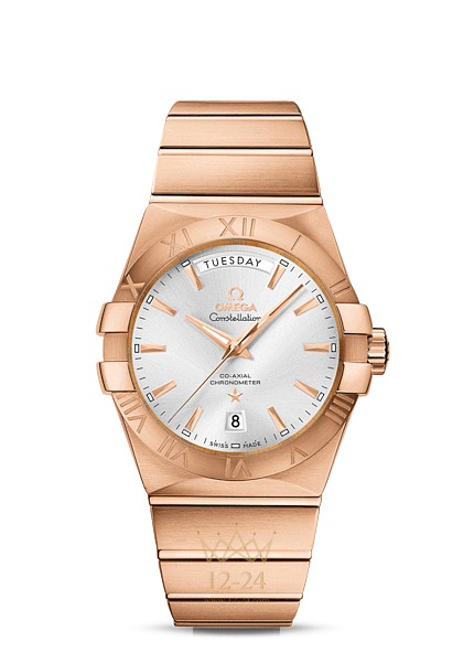 Эта модель имеет серебристый циферблат с окошками указателей дня недели и даты в положениях «12 часов» и «6 часов», который накрыт устойчивым к царапинам сапфировым стеклом. Безель с римскими цифрами закреплен на корпусе диаметром 38 мм из 18-каратного розового золота. Часы дополняет браслет из 18-каратного розового золота. Сквозь прозрачную заднюю крышку корпуса виден коаксиальный часовой механизм OMEGA, калибр 8612.