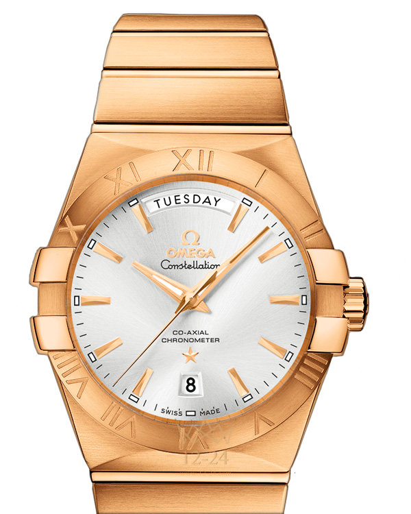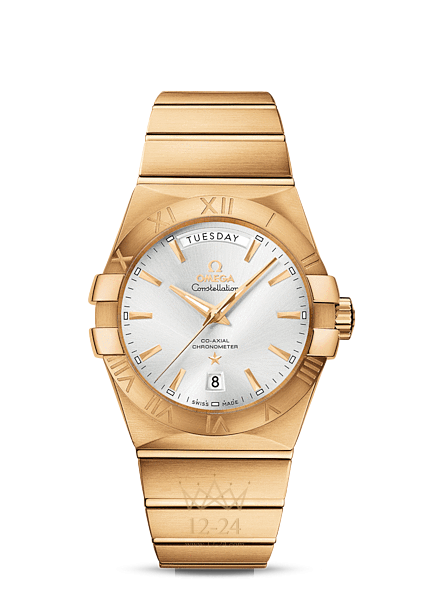 Эта модель имеет серебристый циферблат с окошками указателей даты и дня недели в положениях «12 часов» и «6 часов», который накрыт устойчивым к царапинам сапфировым стеклом. Безель с римскими цифрами закреплен на корпусе диаметром 38 мм из 18-каратного желтого золота. Часы дополняет браслет из 18-каратного желтого золота. Сквозь прозрачную заднюю крышку корпуса виден коаксиальный часовой механизм OMEGA, калибр 8612.