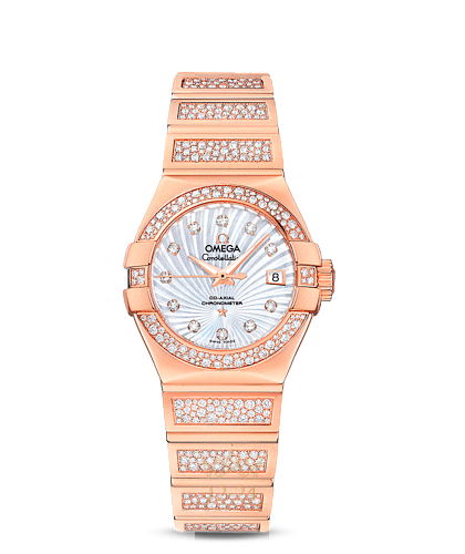 Эта полированная модель имеет белый перламутровый циферблат с узором Supernova и бриллиантовыми часовыми метками, который накрыт устойчивым к царапинам сапфировым стеклом. Безель с паве из разноразмерных бриллиантов закреплен на корпусе диаметром 27 мм из 18-каратного розового золота. Часы дополняет из 18-каратного розового золота с бриллиантовыми паве прямоугольной формы на звеньях. Основу этих часов составляет коаксиальный часовой механизм OMEGA, калибр 8521, который виден сквозь прозрачную заднюю крышку корпуса.