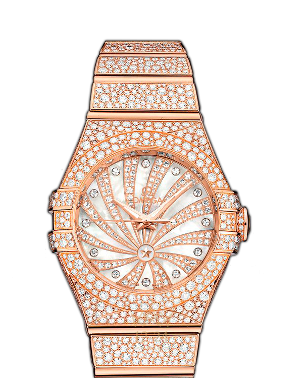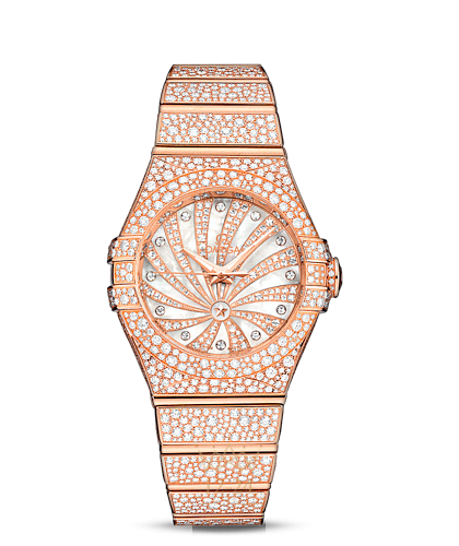 Эта роскошная модель имеет украшенный бриллиантами циферблат из 18-каратного золота с белым перламутровым узором Supernova, накрытый устойчивым к царапинам сапфировым стеклом. Корпус диаметром 31 мм из 18-каратного розового золота с золотым безелем дополнен браслетом из 18-каратного розового золота. Безель, корпус и звенья браслета украшены паве из разноразмерных бриллиантов. В этих часах с более чем 2000 бриллиантов используется коаксиальный часовой механизм OMEGA, калибр 8421, который виден сквозь прозрачную заднюю крышку корпуса.