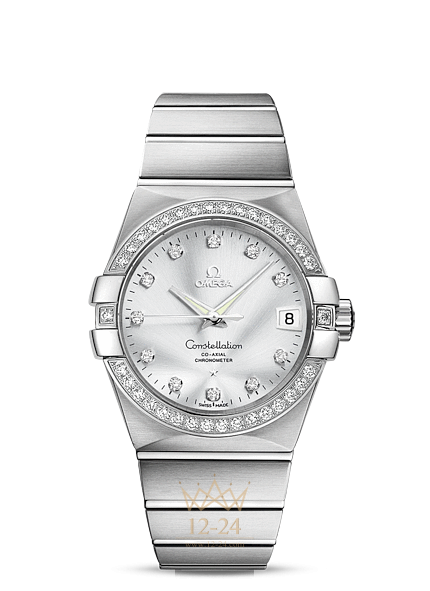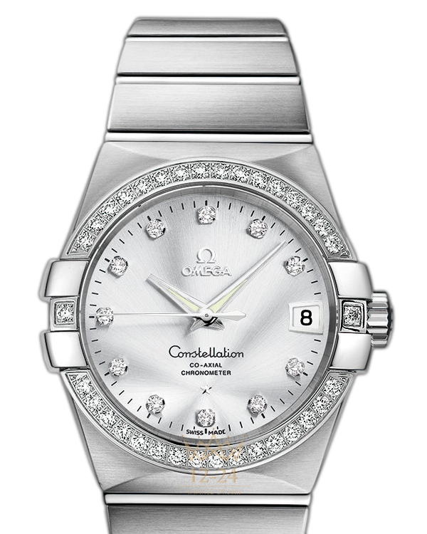 Эта модель имеет украшенный бриллиантовыми часовыми метками серебристый циферблат с окошком указателя даты в положении «3 часа» и устойчивым к царапинам сапфировым стеклом. Украшенный бриллиантами безель закреплен на корпусе диаметром 38 мм из 18-каратного белого золота, который дополнен браслетом из 18-каратного белого золота. В этих изысканных часах используется коаксиальный часовой механизм OMEGA, калибр 8501, который виден сквозь прозрачную заднюю крышку корпуса.