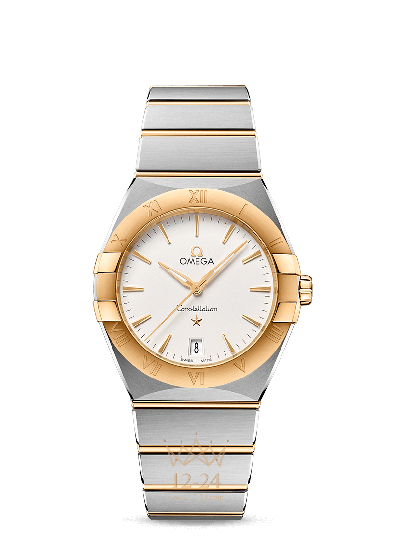 Модель из нержавеющей стали и 18-каратного желтого золота имеет корпус диаметром 36 мм, безель с выгравированными римскими цифрами, опаловый серебристый циферблат с окошком указателя даты в положении "6 часов". Стрелки, логотип OMEGA, звезда Constellation и индексы также выполнены из 18-каратного желтого золота.