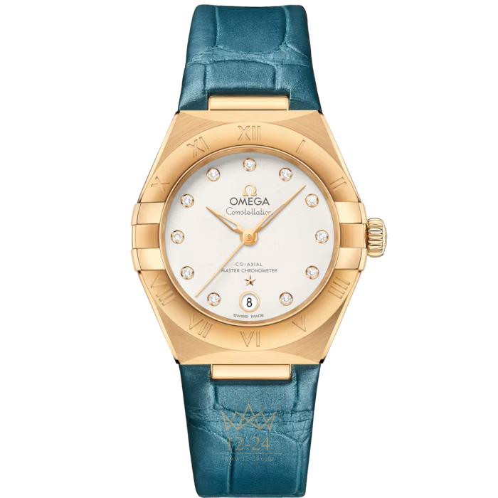 Модель из 18-каратного желтого золота имеет корпус диаметром 29 мм, безель с выгравированными римскими цифрами и серебристо-белый циферблат с бриллиантовыми часовыми отметками и окошком указателя даты в положении "6 часов". Стрелки, логотип OMEGA, звезда Constellation и оправа бриллиантов также выполнены из 18-каратного желтого золота