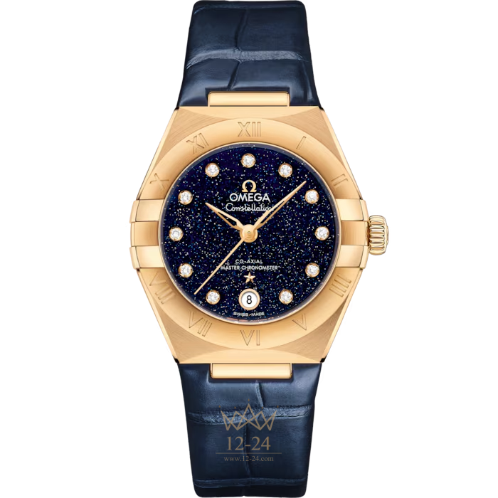 Эта модель из желтого золота имеет корпус диаметром 29 мм, безель с выгравированными римскими цифрами и синий циферблат из авантюринового стекла с бриллиантовыми часовыми индексами и окошком указателя даты в положении "6 часов". Стрелки, логотип OMEGA, звезда Constellation и оправа бриллиантов также выполнены из 18-каратного желтого золота.
