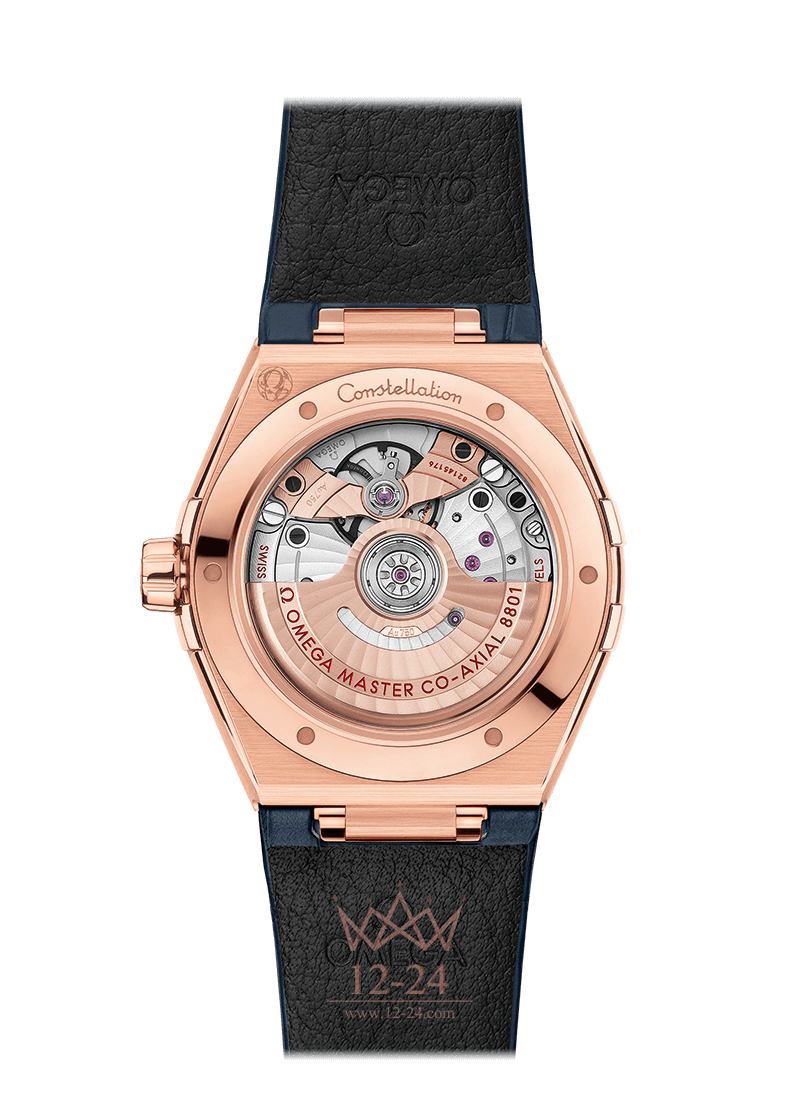 Часы с синим кожаным ремешком оснащены калибром OMEGA Co-Axial Master Chronometer 8801, который можно рассмотреть сквозь устойчивое к царапинам выпуклое сапфировое стекло задней крышки корпуса.