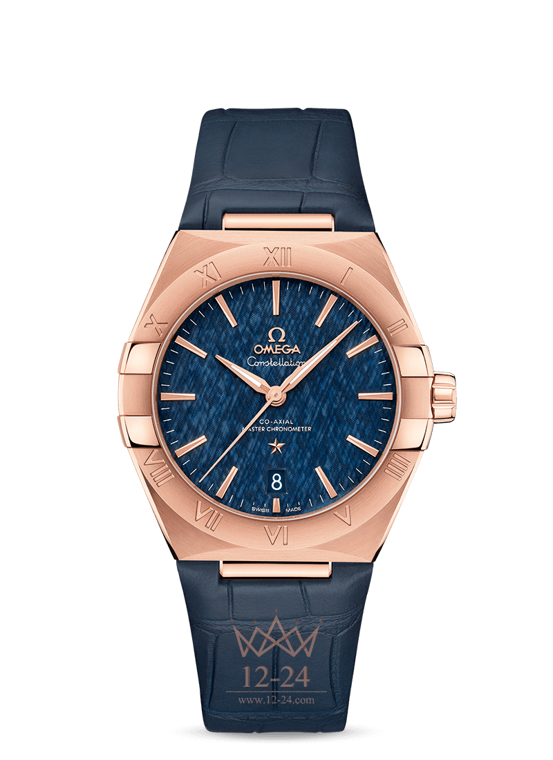 Модель из 18-каратного золота Sedna™ имеет корпус диаметром 39 мм, безель с выгравированными римскими цифрами, синий циферблат с рельефным узором и шелковистой текстурой и окошком указателя даты в положении "6 часов". Стрелки, логотип OMEGA, звезда Constellation и индексы также выполнены из 18-каратного золота Sedna™.