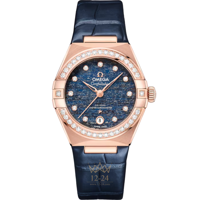 Выполненные из 18-каратного золота Sedna™ часы украшает безель с инкрустацией бриллиантами и индикатор даты у отметки 6 часов. Стрелки, часовые отметки, логотип OMEGA и звезда Constellation выполнены из 18-каратного золота Sedna™.