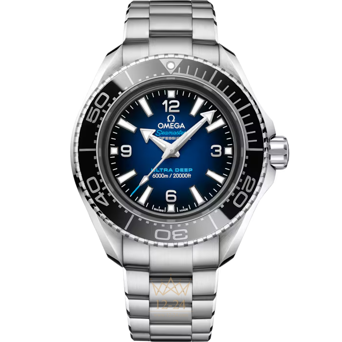 Модель диаметром 45,5 мм из прочного материала O-MEGASTEEL имеет полированный безель из керамики черного цвета с дайверской шкалой из материала Liquidmetal™. Стрелки и индексы выполнены из 18-каратного белого золота и покрыты белым люминесцентным составом Super-LumiNova. Через выпуклое сапфировое стекло виден лакированный циферблат с градиентным переходом от синего к черному.