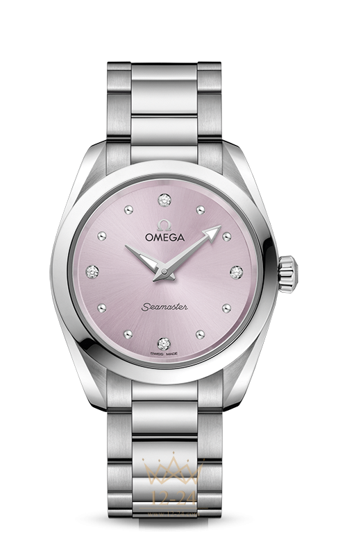 Симметричный корпус этой модели диаметром 28 мм выполнен из нержавеющей стали. На глянцевом сиреневом циферблате располагаются 8 индексов в виде точек с родиевым покрытием и 4 бриллиантовых индекса в оправе с родиевым покрытием. Дизайн дополняют стрелки с родиевым покрытием и задняя крышка с тисненым изображением морского конька OMEGA на фоне волн.