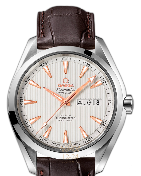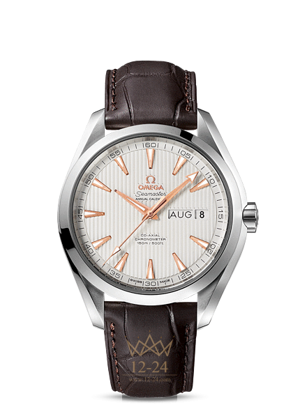 Эти высокопрочные часы классического дизайна воздают должное богатому морскому наследию OMEGA. Эффектный, мгновенно узнаваемый дизайн циферблата, характерный для коллекции OMEGA Seamaster Aqua Terra 150M, напоминает тиковое покрытие роскошных яхт. Данная модель имеет стрелки и часовые индексы из 18-каратного розового золота на серебристом циферблате с узором из вертикальных полос (Teak Concept) и окошками указателей месяца и даты в положении «3 часа». Оригинальный циферблат защищен устойчивым к царапинам сапфировым стеклом. Корпус диаметром 43 мм из нержавеющей стали с кожаным ремешком дополнен элегантным безелем. В этих часах используется эксклюзивный коаксиальный часовой механизм OMEGA, калибр 8601.