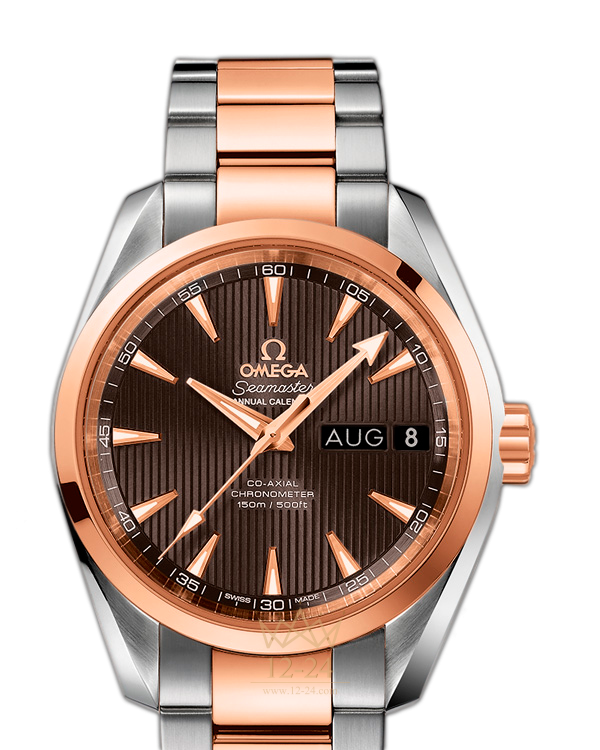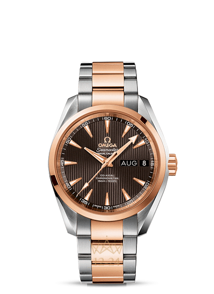 Эти высокопрочные часы классического дизайна воздают должное богатому морскому наследию OMEGA. Эффектный, мгновенно узнаваемый дизайн циферблата, характерный для коллекции OMEGA Seamaster Aqua Terra 150M, напоминает тиковое покрытие роскошных яхт. Данная модель имеет серый циферблат с узором из вертикальных полос (Teak Concept) и окошками указателей месяца и даты в положении «3 часа». Безель из 18-каратного розового золота закреплен на корпусе диаметром 38,5 мм из нержавеющей стали, который дополнен стальным браслетом со звеньями из 18-каратного розового золота. В этом сертифицированном хронометре используется коаксиальный часовой механизм OMEGA, калибр 8601.