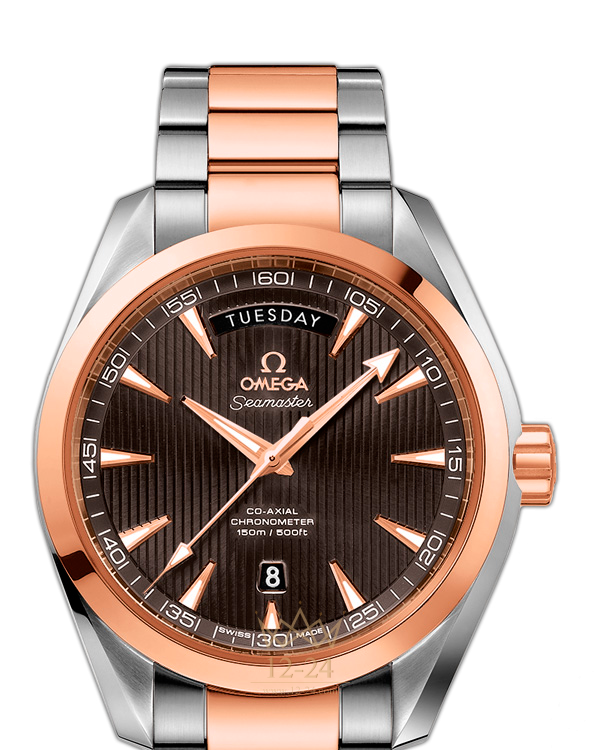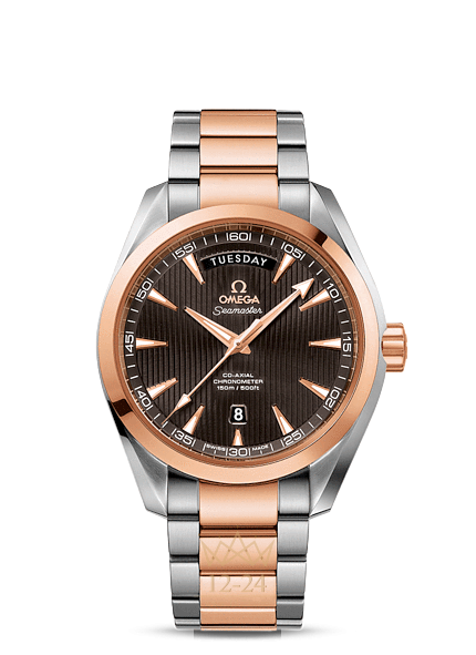 Эти высокопрочные часы классического дизайна воздают должное богатому морскому наследию OMEGA. Эффектный, мгновенно узнаваемый дизайн циферблата, характерный для коллекции OMEGA Seamaster Aqua Terra 150M, напоминает тиковое покрытие роскошных яхт. Эта модель имеет серый лаковый циферблат с узором из вертикальных полос (Teak Concept). Указатель даты находится в положении «6 часов», указатель дня недели – в положении «12 часов». Оригинальный циферблат защищен устойчивым к царапинам сапфировым стеклом. Безель из 18-каратного розового золота закреплен на корпусе диаметром 41,5 мм из нержавеющей стали, который дополнен браслетом из 18-каратного розового золота и нержавеющей стали. В этом сертифицированном хронометре используется коаксиальный часовой механизм OMEGA, калибр 8602, который хорошо виден сквозь прозрачную заднюю крышку корпуса.