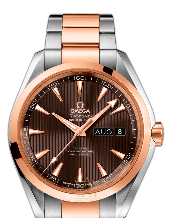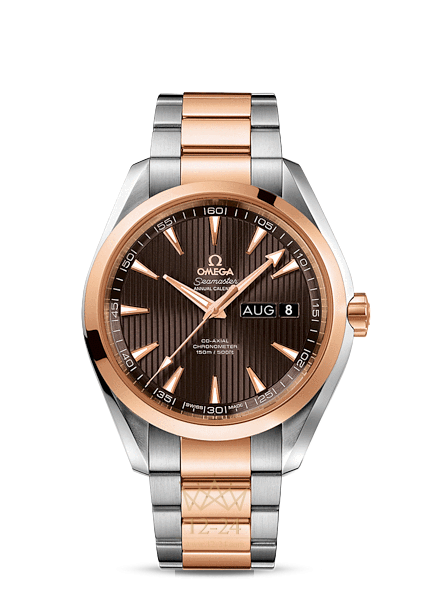 Эти высокопрочные часы классического дизайна воздают должное богатому морскому наследию OMEGA. Эффектный, мгновенно узнаваемый дизайн циферблата, характерный для коллекции OMEGA Seamaster Aqua Terra 150M, напоминает тиковое покрытие роскошных яхт. Данная модель имеет серый циферблат с узором из вертикальных полос (Teak Concept) и окошками указателей месяца и даты в положении «3 часа». Безель из 18-каратного розового золота закреплен на корпусе диаметром 43 мм из нержавеющей стали, который дополнен стальным браслетом со звеньями из 18-каратного розового золота. В этом сертифицированном хронометре используется коаксиальный часовой механизм OMEGA, калибр 8601.