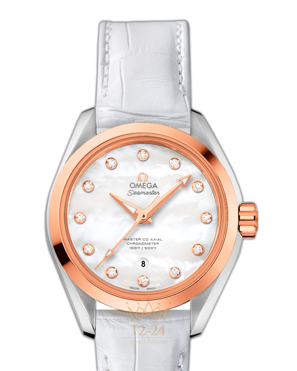 Часы Seamaster Aqua Terra Master Co-Axial оснащены одним из самых передовых в мире часовых механизмов. Стильная модель в спортивном стиле превосходно подходит тем, кто ведет активный образ жизни. Эти роскошные часы имеют жемчужно-перламутровый циферблат с 12 бриллиантовыми часовыми метками в оправе из 18-каратного золота. Женские наручные часы в корпусе диаметром 34 мм из 18-каратного золота Sedna™ и нержавеющей стали дополняет белый кожаный ремешок с перламутровым эффектом. Основу часов составляет революционный часовой механизм OMEGA Master Co-Axial, калибр 8520.
