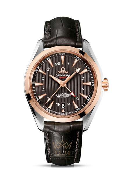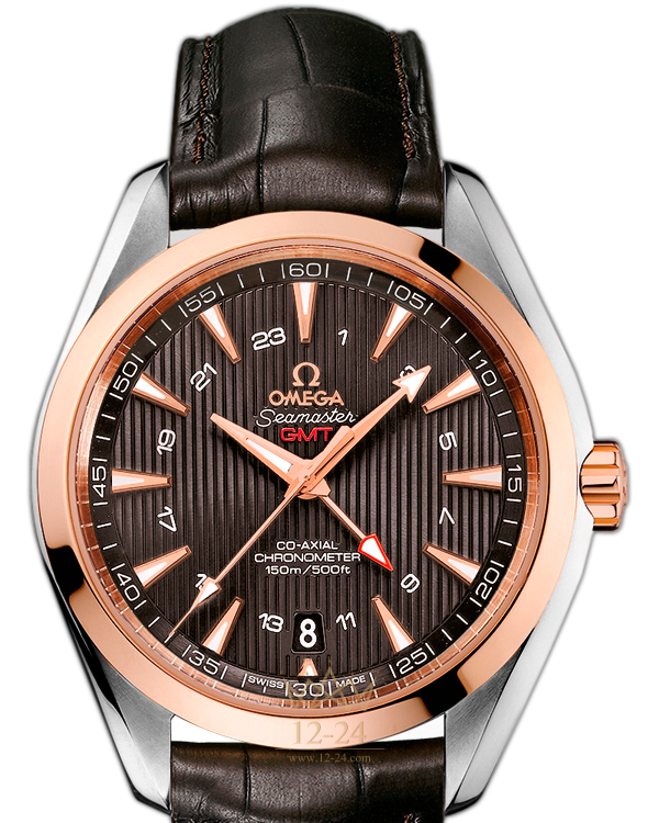 Эти высокопрочные часы с классическим дизайном воздают должное богатому морскому наследию OMEGA. Эффектный, мгновенно узнаваемый дизайн циферблата, характерный для коллекции OMEGA Seamaster Aqua Terra 150M, напоминает текстуру тикового покрытия роскошных яхт. Данная модель имеет серый циферблат, оформленный в стиле фирменной «тиковой концепции», с окошком указателя даты в положении «6 часов». Помимо центральных часовой, минутной и секундной стрелок на циферблате имеется стрелка GMT, которая совершает полный оборот каждые 24 часа. Оригинальный циферблат защищен устойчивым к царапинам сапфировым стеклом. Корпус диаметром 43 мм из нержавеющей стали с коричневым кожаным ремешком дополнен безелем из 18-каратного красного золота. В этом сертифицированном хронометре используется коаксиальный часовой механизм OMEGA, калибр 8605, который хорошо виден через прозрачную заднюю крышку.