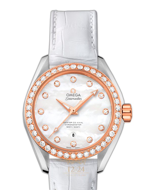 Часы Seamaster Aqua Terra Master Co-Axial оснащены одним из самых передовых в мире часовых механизмов. Стильная модель в спортивном стиле превосходно подходит тем, кто ведет активный образ жизни. Эти роскошные часы имеют жемчужно-перламутровый циферблат с 12 бриллиантовыми часовыми метками в оправе из 18-каратного золота. Женские наручные часы в корпусе диаметром 34 мм из 18-каратного золота Sedna™ и нержавеющей стали с украшенным бриллиантами безелем дополняет белый кожаный ремешок с перламутровым эффектом. Основу часов составляет революционный часовой механизм OMEGA Master Co-Axial, калибр 8520.
