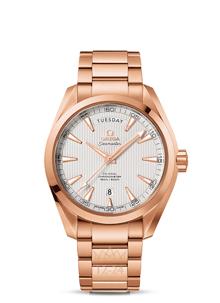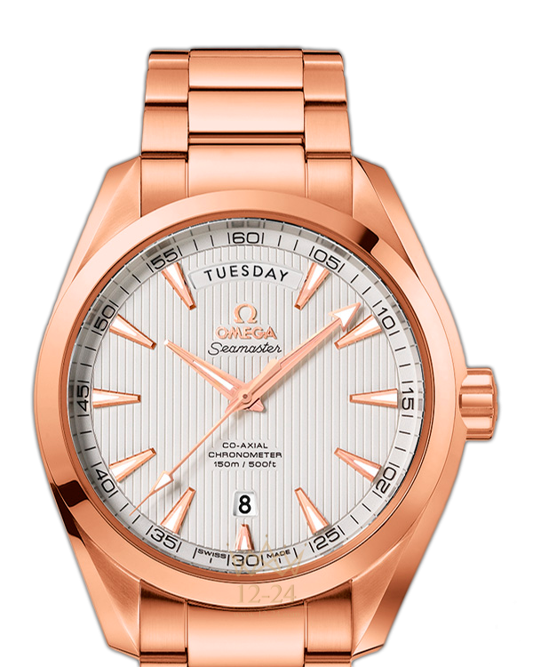 Эти высокопрочные часы классического дизайна воздают должное богатому морскому наследию OMEGA. Эффектный, мгновенно узнаваемый дизайн циферблата, характерный для коллекции OMEGA Seamaster Aqua Terra 150M, напоминает тиковое покрытие роскошных яхт. Эта модель имеет серебристый циферблат с узором из вертикальных полос (Teak Concept). Указатель даты находится в положении «6 часов», указатель дня недели – в положении «12 часов». Оригинальный циферблат защищен устойчивым к царапинам сапфировым стеклом. Безель закреплен на корпусе диаметром 41,5 мм из 18-каратного розового золота с браслетом из 18-каратного розового золота. В этом сертифицированном хронометре используется коаксиальный часовой механизм OMEGA, калибр 8612, который хорошо виден сквозь прозрачную заднюю крышку корпуса.