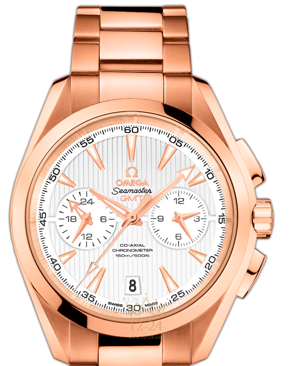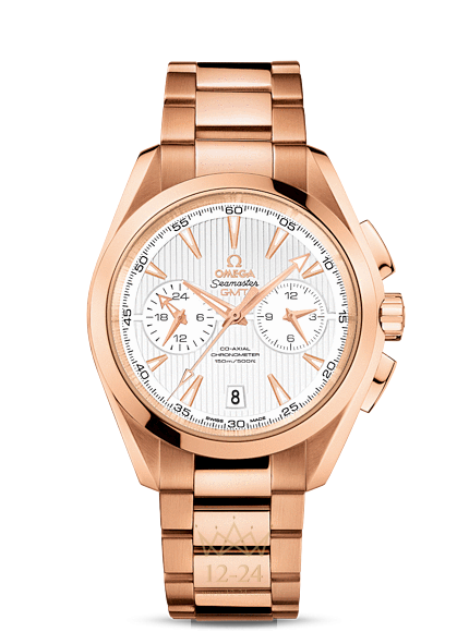 Эти высокопрочные часы классического дизайна воздают должное богатому морскому наследию OMEGA. Эффектный, мгновенно узнаваемый дизайн циферблата, характерный для коллекции OMEGA Seamaster Aqua Terra 150M, напоминает тиковое покрытие роскошных яхт. Эта модель имеет серебристый циферблат с узором из вертикальных полос (Teak Concept) и белыми лакированными вспомогательными циферблатами. В положении «9 часов» находится вспомогательный циферблат малой секундной стрелки со стрелкой GMT. 60-минутный и 12-часовой счетчики объединены на одном индикаторе в положении «3 часа», что облегчает считывание результатов хронометража. Оригинальный циферблат защищен устойчивым к царапинам сапфировым стеклом. Безель закреплен на корпусе диаметром 43 мм из 18-каратного розового золота, который дополнен таким же золотым браслетом. В часах Seamaster Aqua Terra 150M Chronograph GMT используется коаксиальный часовой механизм OMEGA, калибр 9615, который виден сквозь прозрачную заднюю крышку корпуса.