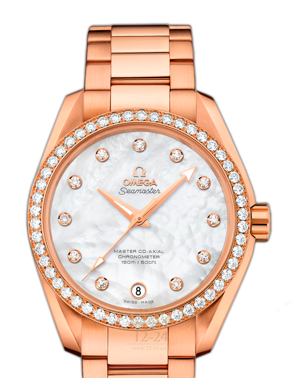 Часы Seamaster Aqua Terra Master Co-Axial оснащены одним из самых передовых в мире часовых механизмов. Стильная модель в спортивном стиле превосходно подходит тем, кто ведет активный образ жизни. Эти роскошные часы имеют жемчужно-перламутровый циферблат с 11 бриллиантовыми часовыми метками в оправе из 18-каратного золота. Женские наручные часы в корпусе диаметром 38,5 мм из 18-каратного розового золота с украшенным бриллиантами безелем дополняет браслет из 18-каратного розового золота. Основу часов составляет революционный часовой механизм OMEGA Master Co-Axial, калибр 8501.