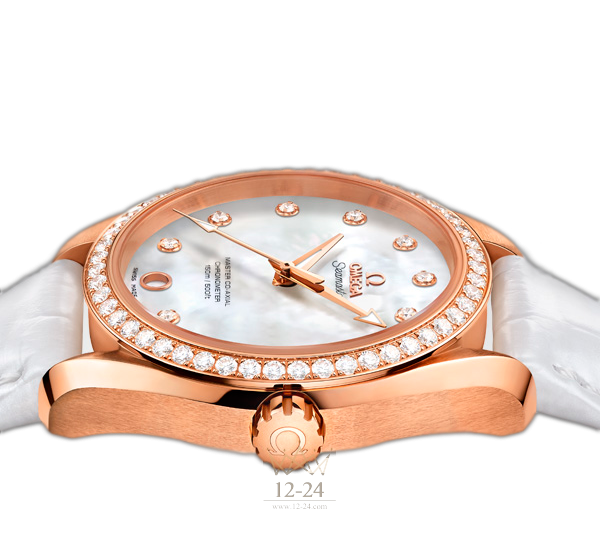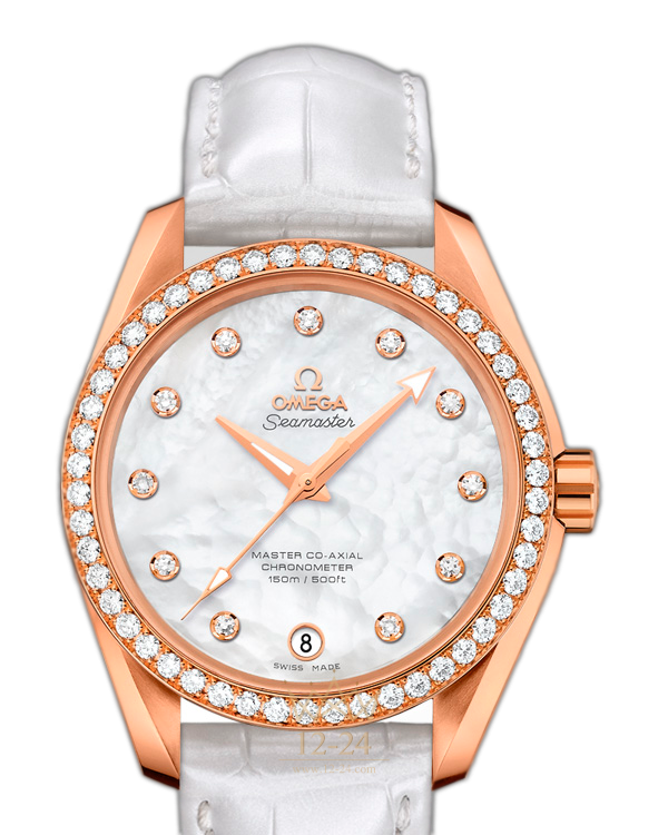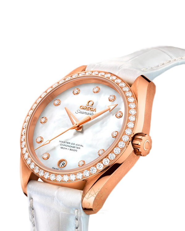 Часы Seamaster Aqua Terra Master Co-Axial оснащены одним из самых передовых в мире часовых механизмов. Стильная модель в спортивном стиле превосходно подходит тем, кто ведет активный образ жизни. Эти роскошные часы имеют жемчужно-перламутровый циферблат с 11 бриллиантовыми часовыми метками в оправе из 18-каратного золота. Женские наручные часы в корпусе диаметром 38,5 мм из 18-каратного розового золота с украшенным бриллиантами безелем дополняет белый кожаный ремешок с перламутровым эффектом. Основу часов составляет революционный часовой механизм OMEGA Master Co-Axial, калибр 8501, способный выдерживать воздействие магнитных полей силой более 15000 гаусс.