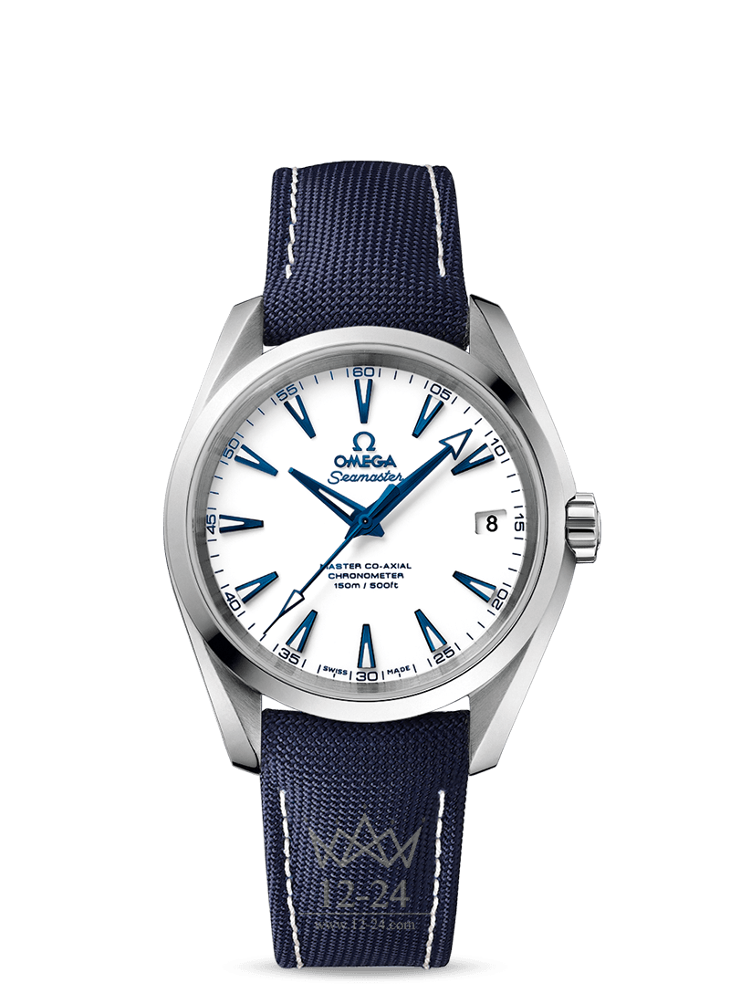 Часы OMEGA Seamaster Aqua Terra 150M GoodPlanet имеют белый лакированный циферблат с накладными синими индексами, синеными гранеными стрелками в центре (часовой, минутной и секундной) и окошком даты в положении «3 часа».