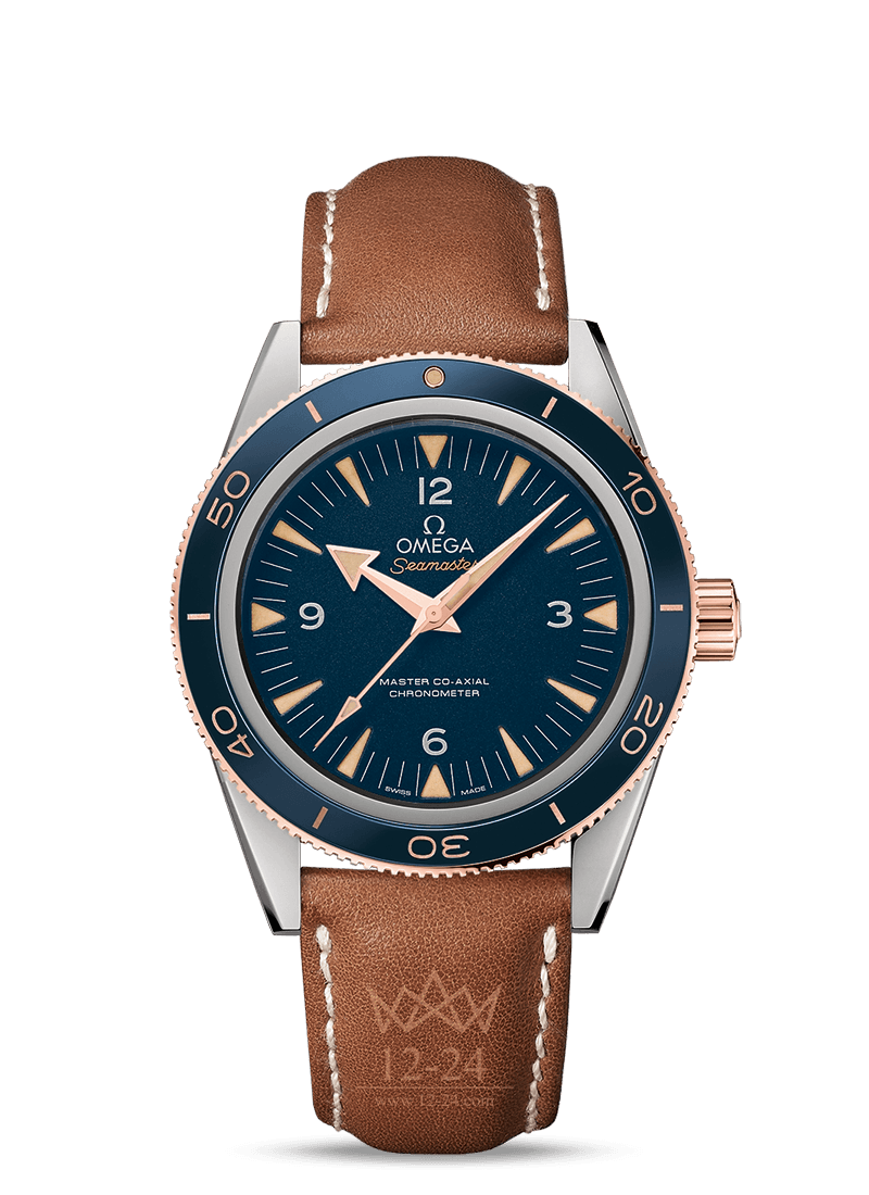 Эти часы Seamaster 300 имеют подвергнутый пескоструйной обработке синий циферблат со стрелками из 18-каратного золота Sedna™, покрытыми люминесцентным составом Super-LumiNova винтажного оттенка. Безель из 18-каратного золота Sedna™ имеет керамическое кольцо с дайверской шкалой Ceragold™. Корпус диаметром 41 мм из титана Grade 5 дополнен коричневым кожаным ремешком.