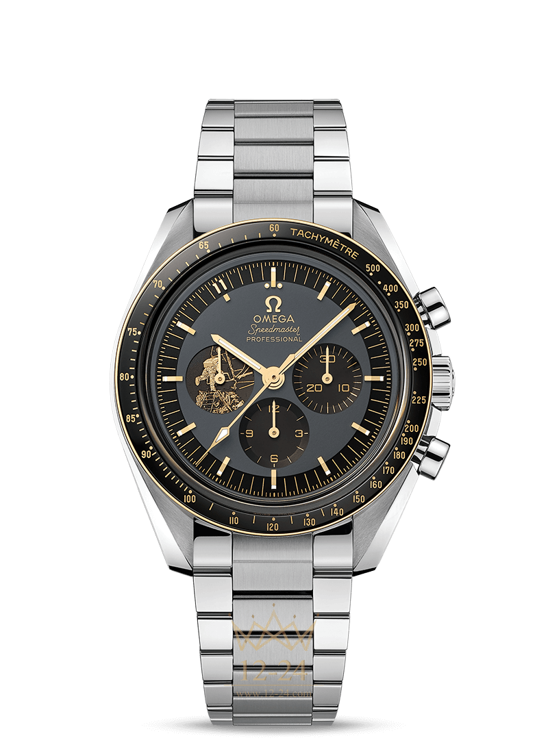 Корпус новых часов диаметром 42 мм изготовлен из нержавеющей стали и снабжен полированным безелем из 18-каратного золота Moonshine™. На фланец безеля из полированной черной керамики [ZrO2] нанесена тахиметрическая шкала из сплава Omega Ceragold™. Все индексы и стрелки на лакированном циферблате серого и черного цветов выполнены из 18-каратного золота Moonshine™. Исключение составляет центральная секундная стрелка хронографа из золота Moonshine с PVD-покрытием. В положении "11 часов" расположена оригинальная часовая метка, а у отметки "9 часов" – особый счетчик из 18-каратного золота Moonshine™ с выгравированным лазером изображением Базза Олдрина, ступающего на лунную поверхность.