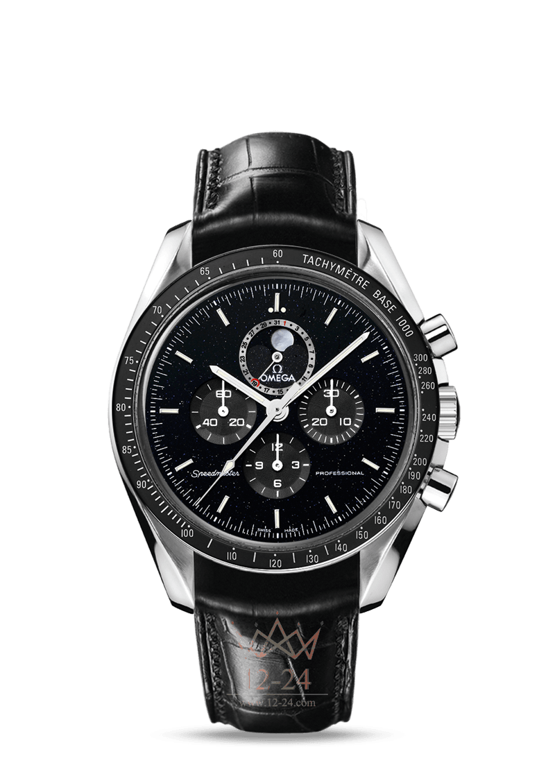 Эта модель OMEGA Speedmaster Professional Moonwatch Moonphase имеет черный авантюриновый циферблат с малой секундной стрелкой, 30-минутным и 12-часовым счетчиками и центральной стрелкой хронографа. На четвертом вспомогательном циферблате в положении «12 часов» имеются указатели фаз Луны и даты.